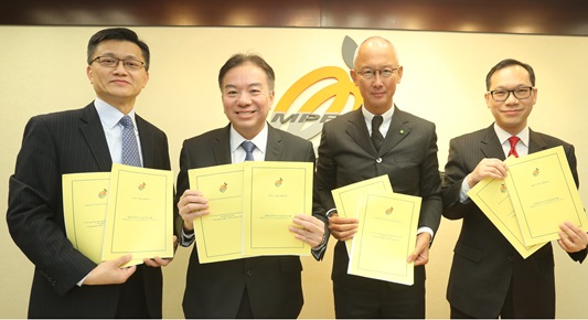 Mandatory Provident Fund Schemes Authority Chairman Dr David Wong (second from left), Non-executive Director Philip Tsai (second from right), Chief Corporate Affairs Officer and Executive Director Cheng Yan-chee (first from left) and Senior Manager of the Research and Statistics Section Edwin Lee (first from right) highlighted the key figures in the report A 15-year Investment Performance Review of the MPF System at a press conference today.