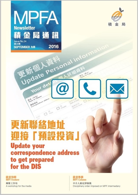 The Default Investment Strategy (DIS) is on the way! The Mandatory Provident Fund Schemes Authority (MPFA) today (28 September) published the latest issue of the MPFA Newsletter, which explains how scheme members should prepare for the launch of the DIS. It also introduces the MPFA’s large-scale publicity campaign reminding scheme members to ensure their trustees have their up-to-date correspondence address in order to receive the latest Mandatory Provident Fund (MPF) related information in a timely manner.