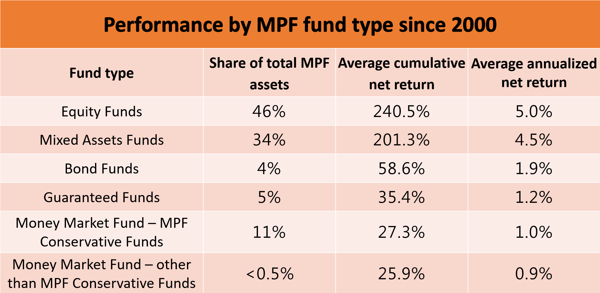 Before the implementation of MPF, only about one-third of Hong Kong’s workforce had some form of retirement protection. With the implementation of MPF System, nearly 100% of the workforce is now covered by retirement protection. As at end-October this year, all fund types had recorded positive annualized investment returns since the inception of MPF System. Equity Funds and Mixed Assets Funds, together accounting for 80% of total MPF assets, have, on average, recorded cumulative net returns of 240% and 200%, or annualized net returns of 5% and 4.5%, respectively, both exceeding the annualized inflation rate of 1.8% for the same period.