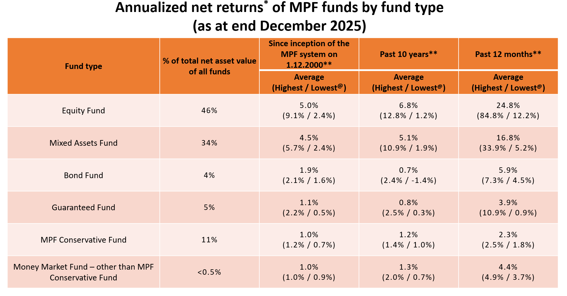 The provisional figures on returns by MPF fund type as at end December 2025 are as follows: