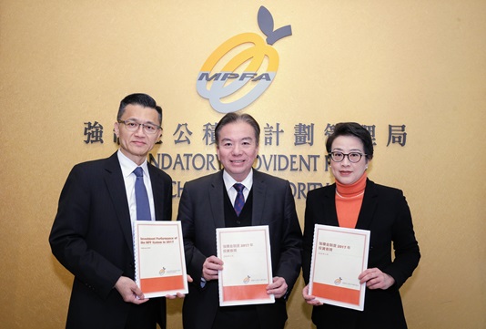 Mandatory Provident Fund Schemes Authority Chairman Dr David Wong (middle), Chief Corporate Affairs Officer and Executive Director Cheng Yan-chee (left) and Chief Operating Officer and Executive Director Alice Law (right) highlighted the investment performance of the Mandatory Provident Fund System in 2017 and introduced the newly launched Fund Performance Platform at a press conference today.
