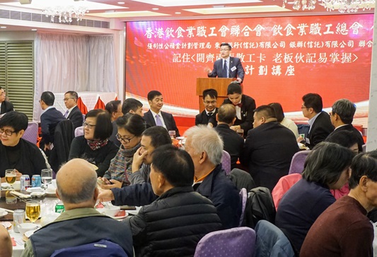 MPFA Chief Corporate Affairs Officer and Executive Director Cheng Yan-chee delivered messages about the MPF Industry Schemes and encouraged casual employees to open casual employee account with each of the two Industry Scheme trustees, in an annual dinner co-organized by the Federation of Hong Kong Food and Beverage Industries Trade Unions and the Eating Establishment Employees General Union.