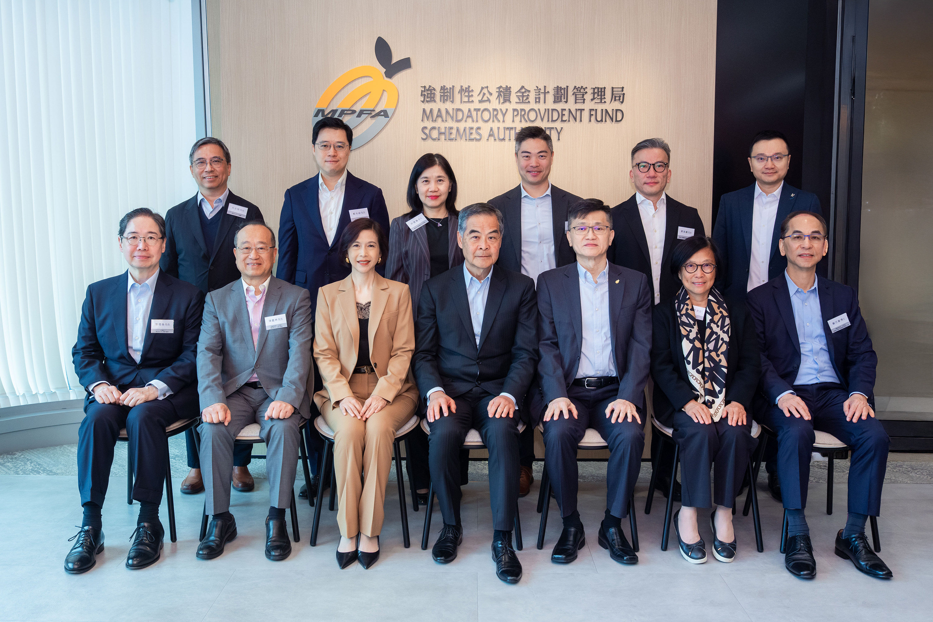圖一:(前排由左至右)積金易公司非執行董事葉禮德、積金易公司非執行董事陳鑑林、積金局及積金易公司主席劉麥嘉軒、全國政協副主席梁振英、積金局行政總監鄭恩賜、積金局非執行董事黃麗君、強積金計劃諮詢委員會主席關百豪