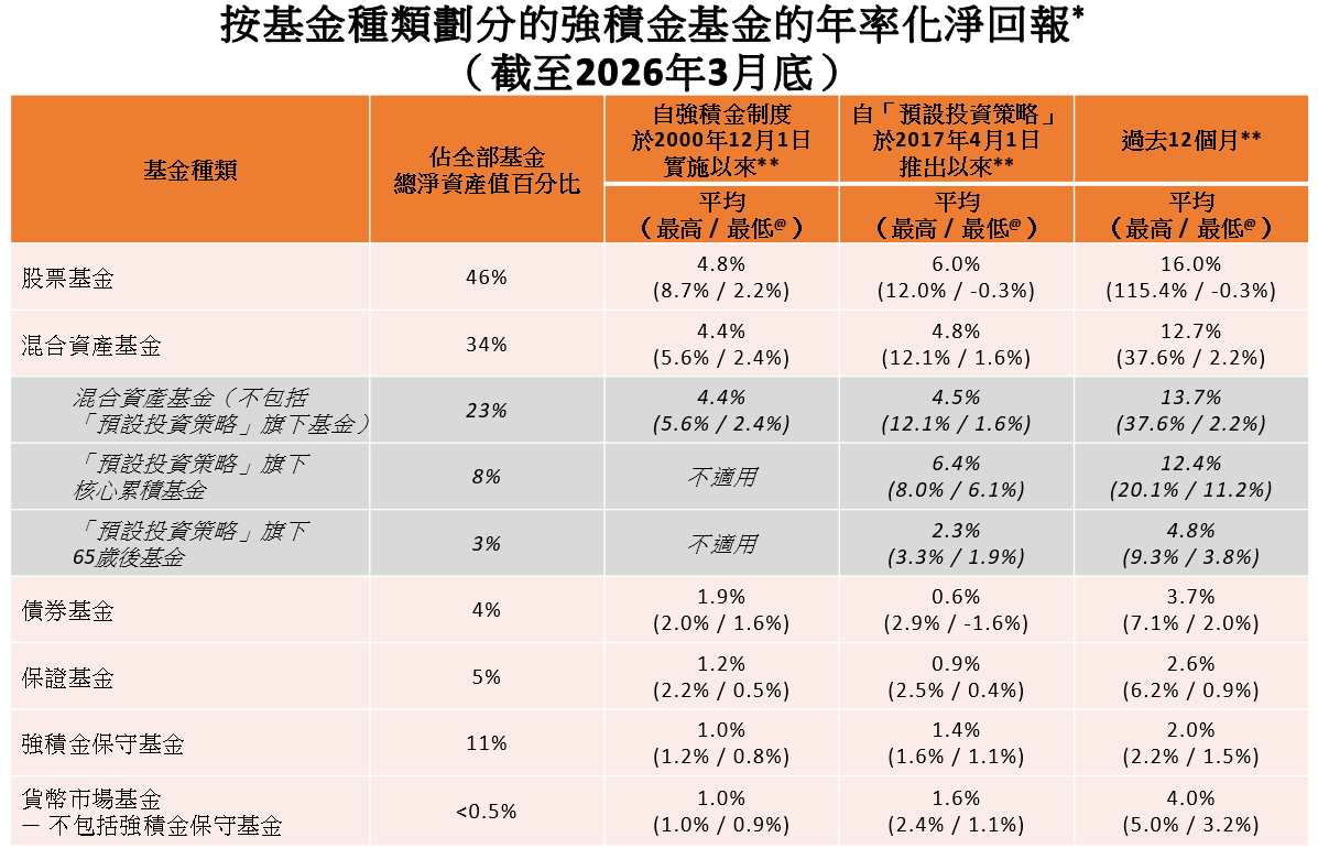 ** 自強積金制度實施以來及自「預設投資策略」推出以來的年率化通脹率均為1.8%;過去12個月的通脹率為1.7%(通脹率數字截至2026年2月)。