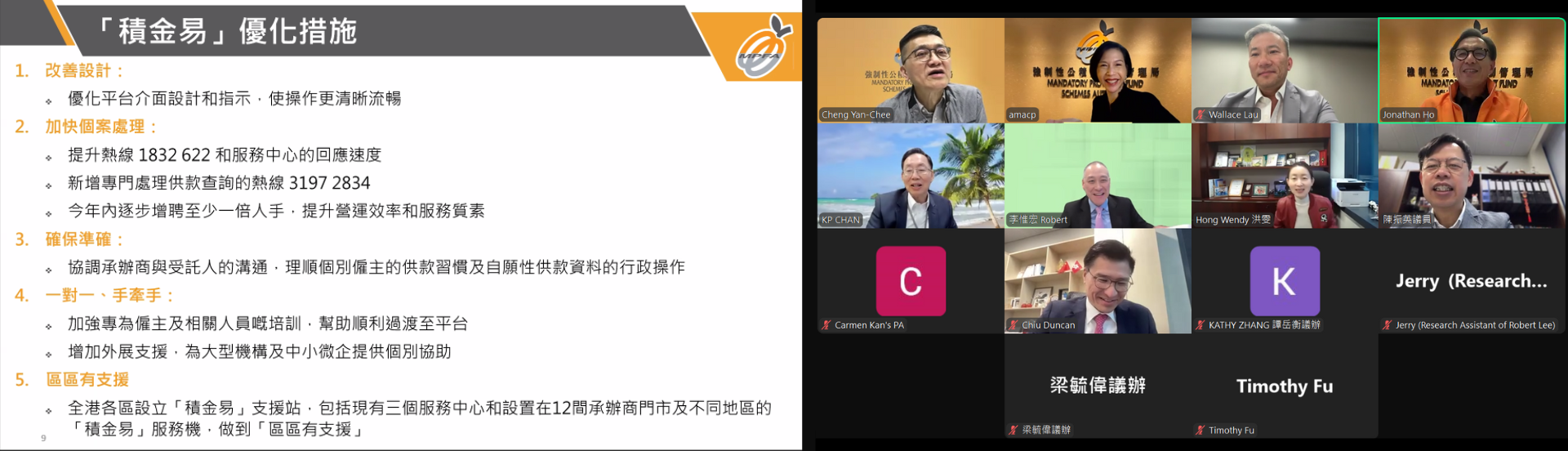 積金局代表先後與自由黨的張宇人議員及邵家輝議員,以及G19的陳健波議員、陳振英議員、李惟宏議員、洪雯議員及邱達根議員線上會面。