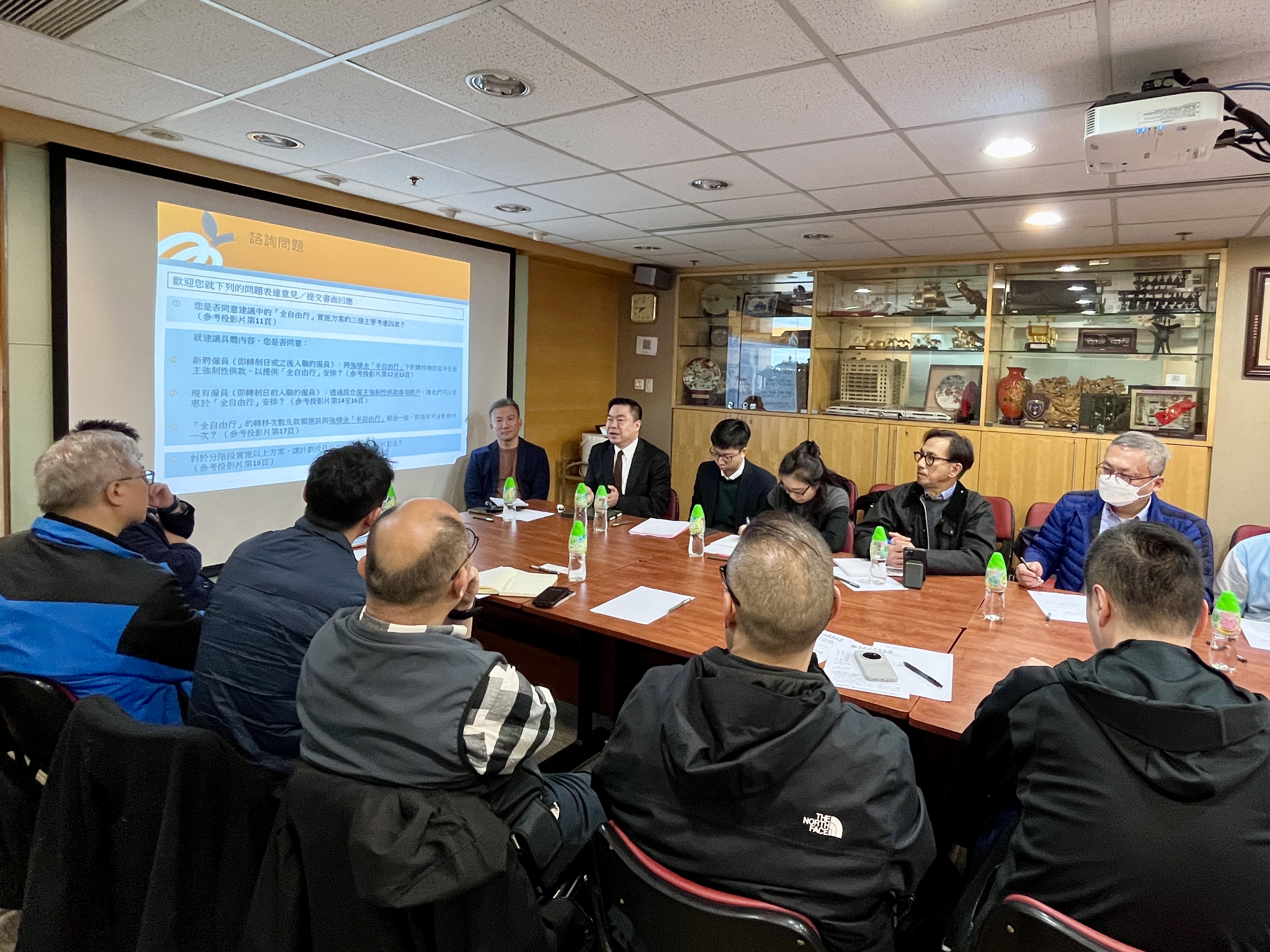 積金局機構事務總監劉家麒、政策法規部主管尤浩然和積金局其他代表於4月1日與香港工會聯合會(工聯會)會面,向工聯會權益委員會委員及工會代表簡介積金局就實施強積金「全自由行」(「全自由行」)的建議方案,並徵詢他們的意見。