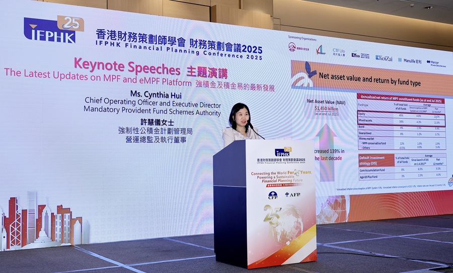 積金局營運總監許慧儀於9月9日擔任由香港財務策劃師學會主辦的財務策劃會議2025的主講嘉賓,與接近300名來自環球及本地的金融業界專才、監管機構及政府代表分享強積金制度和「積金易」平台的最新發展,並闡述強積金多項重大的改革措施。