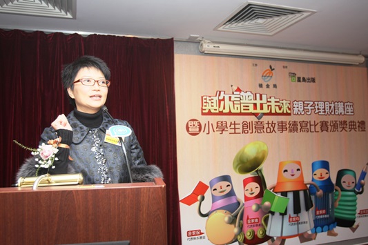 积金局营运总监(执法)于海平女士在颁奖礼上致辞时,鼓励家长与小朋友互相配合,培养子女良好的储蓄习惯及建立正确的理财态度。她并呼吁家长多关心自己的个人理财,包括强积金投资,定时作出检讨。这样做一方面可以在小朋友面前树立一个正确理财的好榜样,亦可以令自己的强积金投资更切合自己的需要。