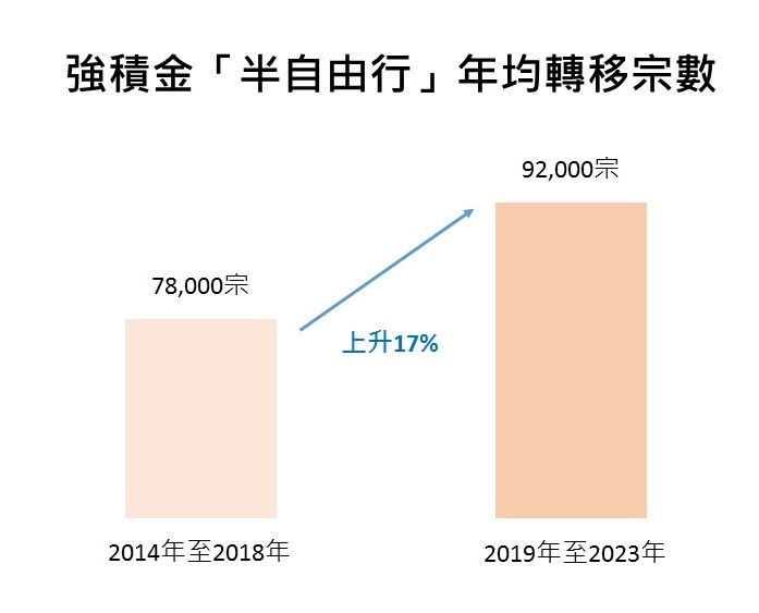 透过「半自由行」转移强积金的个案,最近五年(2019年-2023年)每年平均个案约92,000宗,较之前的五年(2014年-2018年)上升了17%,显示越来越多计划成员主动管理自己的强积金。截至今年9月,累计转移个案已经接近 100万宗,金额超过$480亿。