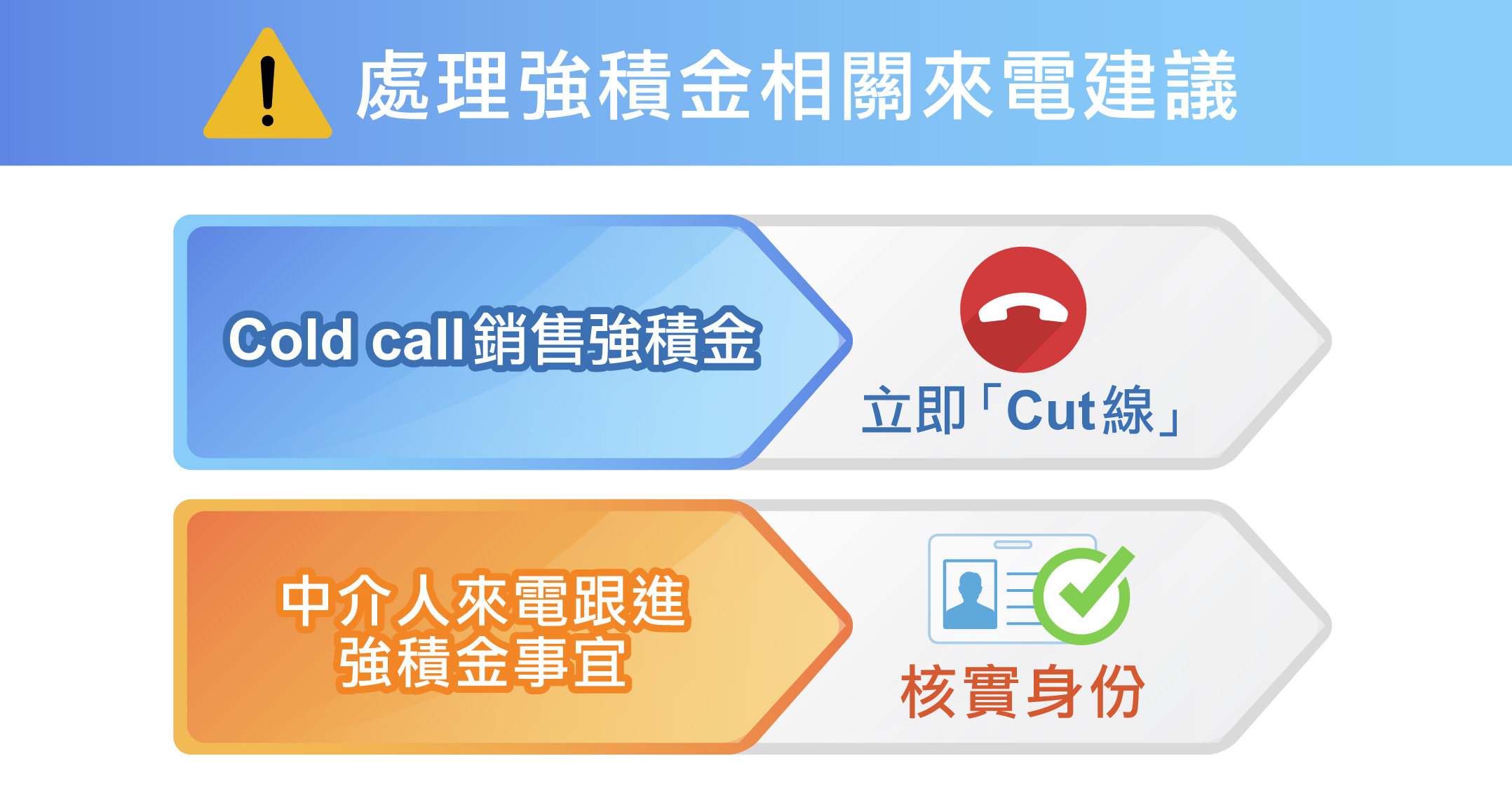因应积金局一系列措施,自去年起以cold call销售强积金产品或服务的中介人比以往已大幅减少。他们亦响应积金局的呼吁,由今年2月起已经全部停止cold call,以防范不法之徒假冒中介人进行诈骗或其他不法活动。换句话说,中介人不会再以cold call销售强积金。