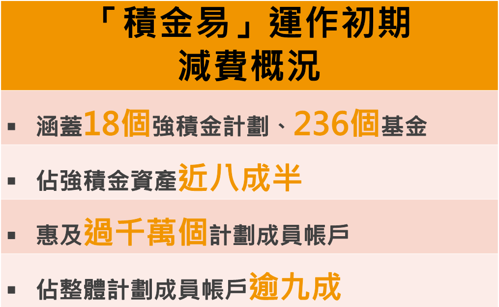 过去一年多,「积金易」的减费成效日渐显着,目前已有10个强积金计划、共110个强积金基金要减行政费。当所有强积金计划加入平台后,全部378个基金中,有236个基金(现时占强积金资产近八成半)的行政费须降至不高于「积金易」目前37点子(0.37%)的收费水平,涵盖18个强积金计划,惠及超过一千万个计划成员帐户,占整体计划成员帐户逾九成。
