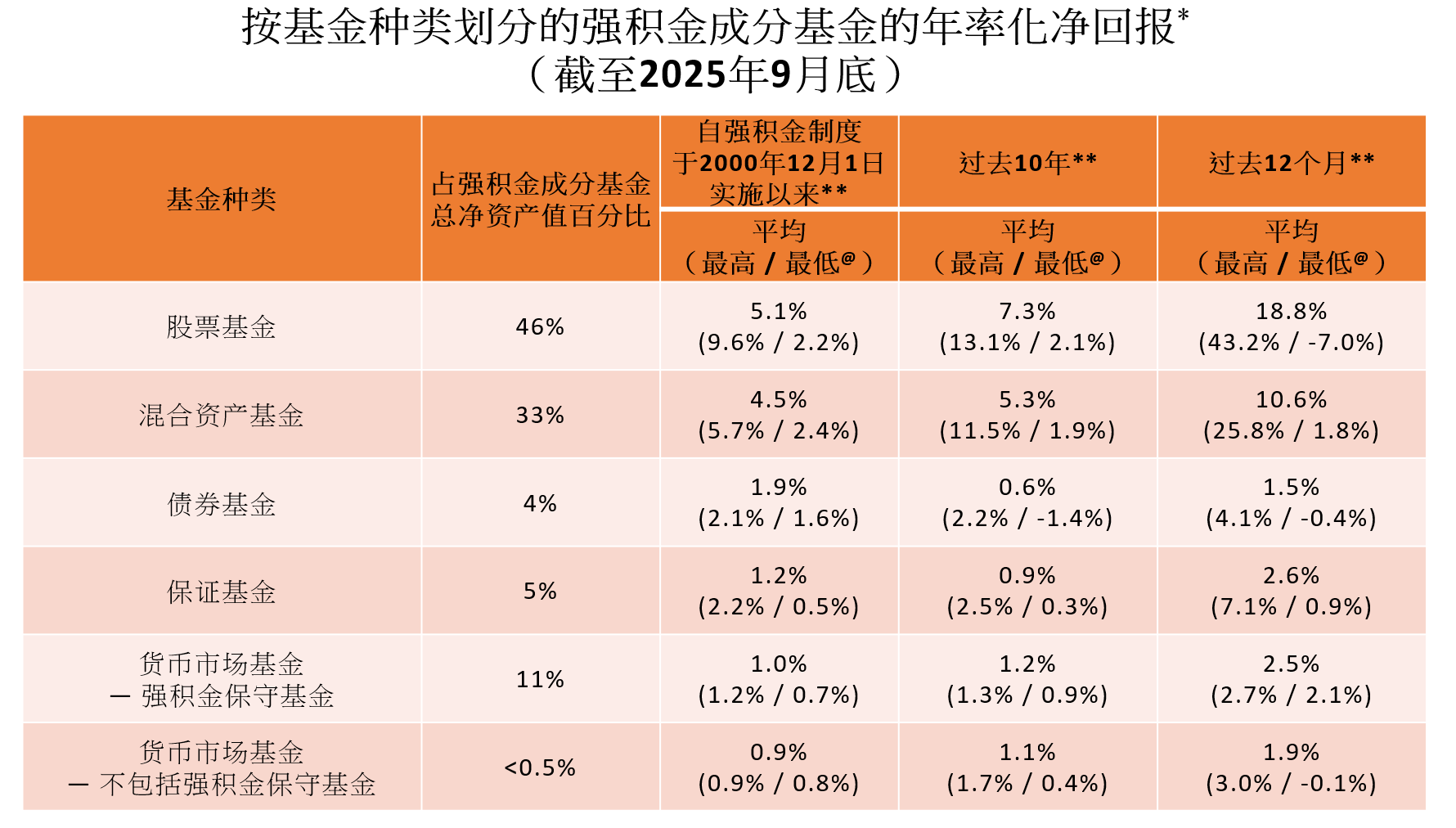 此外,积金局亦公布截至2025年9月底各基金种类的投资回报临时数字,详情如下: