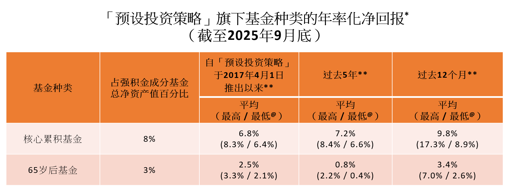 ** 自强积金制度实施以来及自「预设投资策略」推出以来的年率化通胀率均为1.8%;过去10年及过去5年的年率化通胀率分别为2.0%及1.8%;过去12个月的通胀率为1.1%(通胀率数字截至2025年8月)。