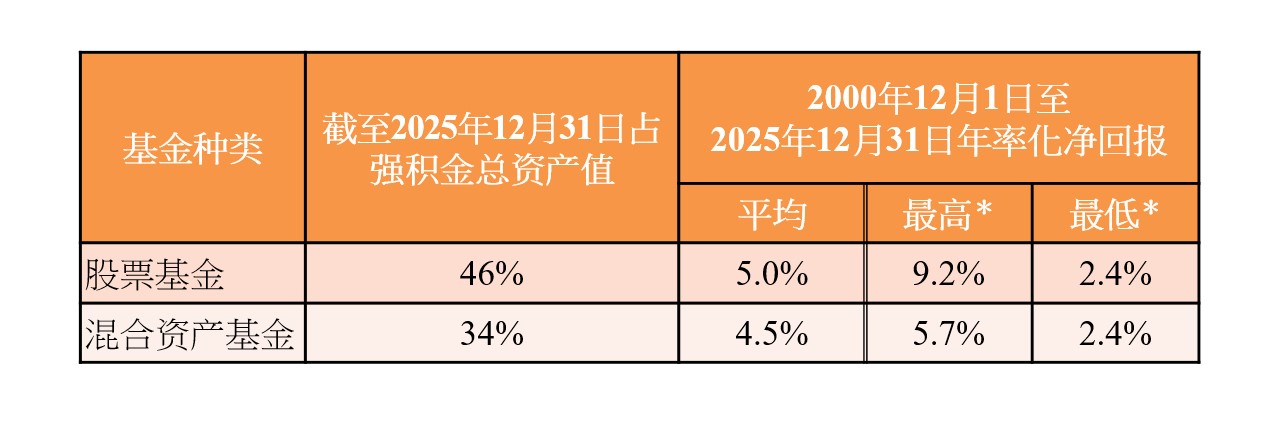 - 自强积金制度在2000年实施以来,合共占强积金总资产值达八成的股票基金及混合资产基金的平均年率化净回报分别为5.0%及4.5%,高于同期1.8%的年率化通胀率。
