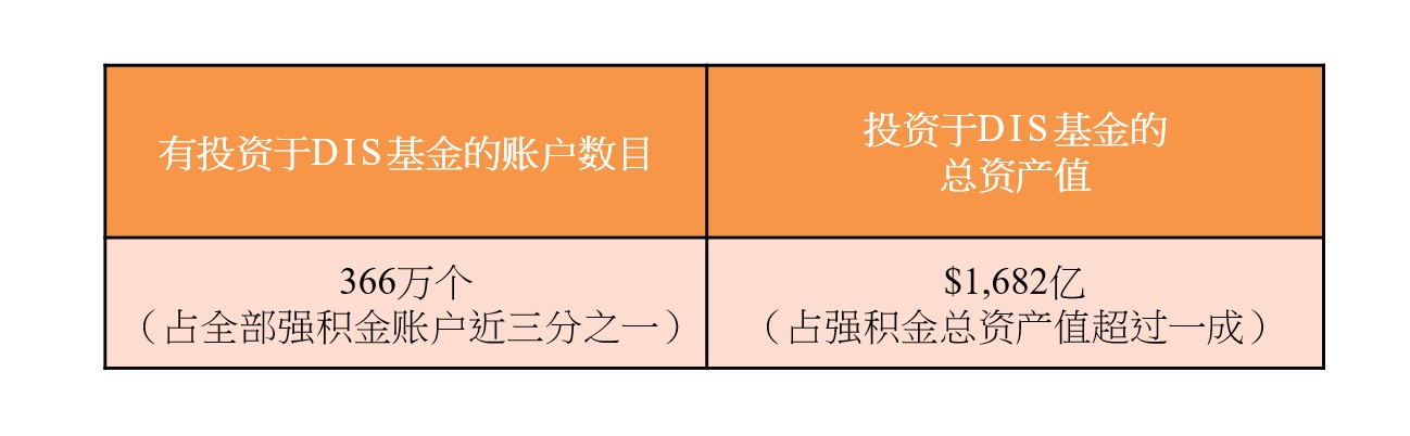 - 截至2025年12月底,366万个强积金帐户有投资于预设投资策略(简称DIS (Default Investment Strategy))旗下基金(或俗称「懒人基金」),占全部1 129万个强积金帐户近三分之一;有关投资总资产值为$1,682亿,占强积金总资产值超过一成。
