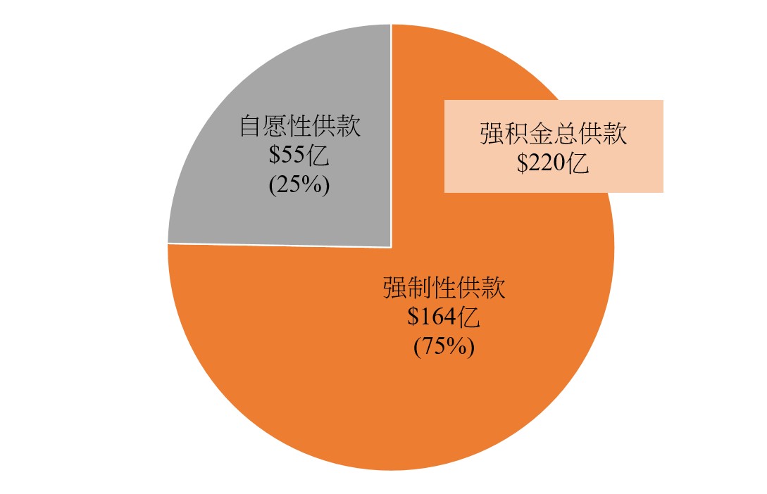 - 2025年全年已收的强积金总供款达$907亿,首次突破$900亿关口。在第四季,已收的强积金总供款共$220亿,当中强制性供款及自愿性供款分别为$164 亿(75%)及$55亿(25%)。该季内已支付强积金权益金额共$126亿。