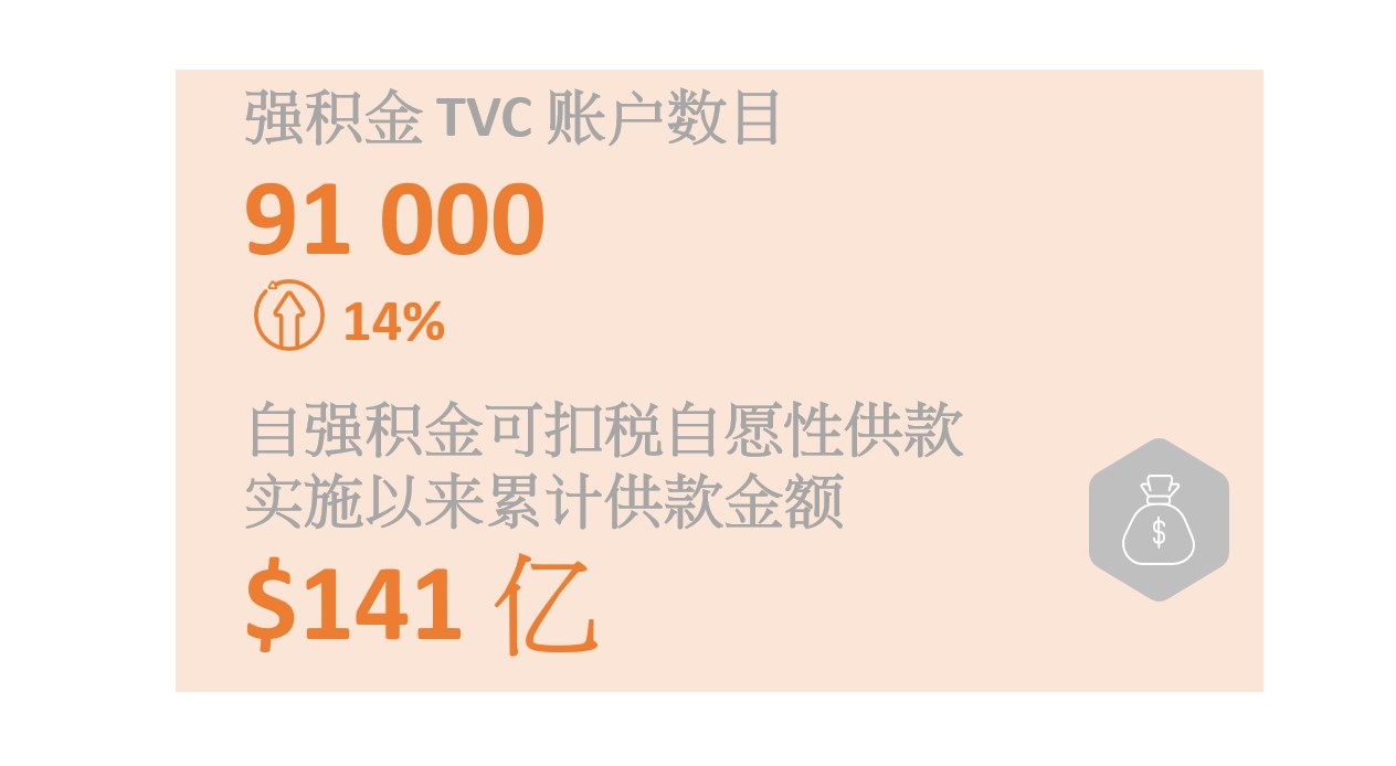 - 截至2025年12月底,强积金可扣税自愿性供款(Tax-deductible Voluntary Contributions (TVC))帐户数目共有91 000个,按年上升14%。自TVC于2019年4月实施以来,相关帐户的累计供款金额为$141亿。