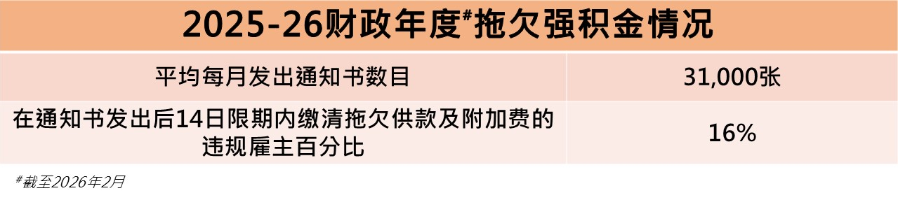 截至今年2月,2025-26财政年度每月平均强积金强制性供款约$55亿。因个别雇主没有依时供款,积金局每月平均发出约31,000张通知书,当中只有约16%的违规雇主按要求在14日限期内缴清拖欠的供款及附加费。