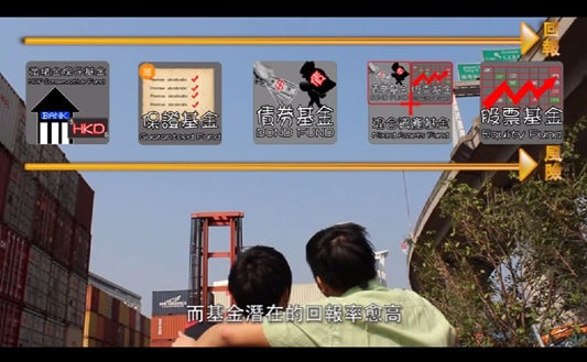 冠军作品「一触即发」的其中一幕介绍不同类型的强积金基金,并解释风险与回报的关系。 |