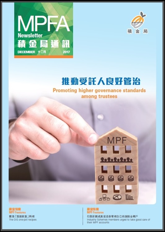强制性公积金计划管理局(积金局)今天出版新一期《积金局通讯》,介绍积金局如何推动强制性公积金计划受托人提高管治水平,为计划成员提供物有所值的产品。 今期「积金特写」则介绍艺人阮小仪为积金局拍摄的最新预设投资策略宣传短片—《煮嘢「预」埋你》。本期通讯亦有报道积金局为行业计划成员举办的宣传教育活动。 《积金局通讯》每季出版一次,并上载至积金局网站。公众可在网上免费订阅电子版的《积金局通讯》。 ─完─ 2017年12月28日