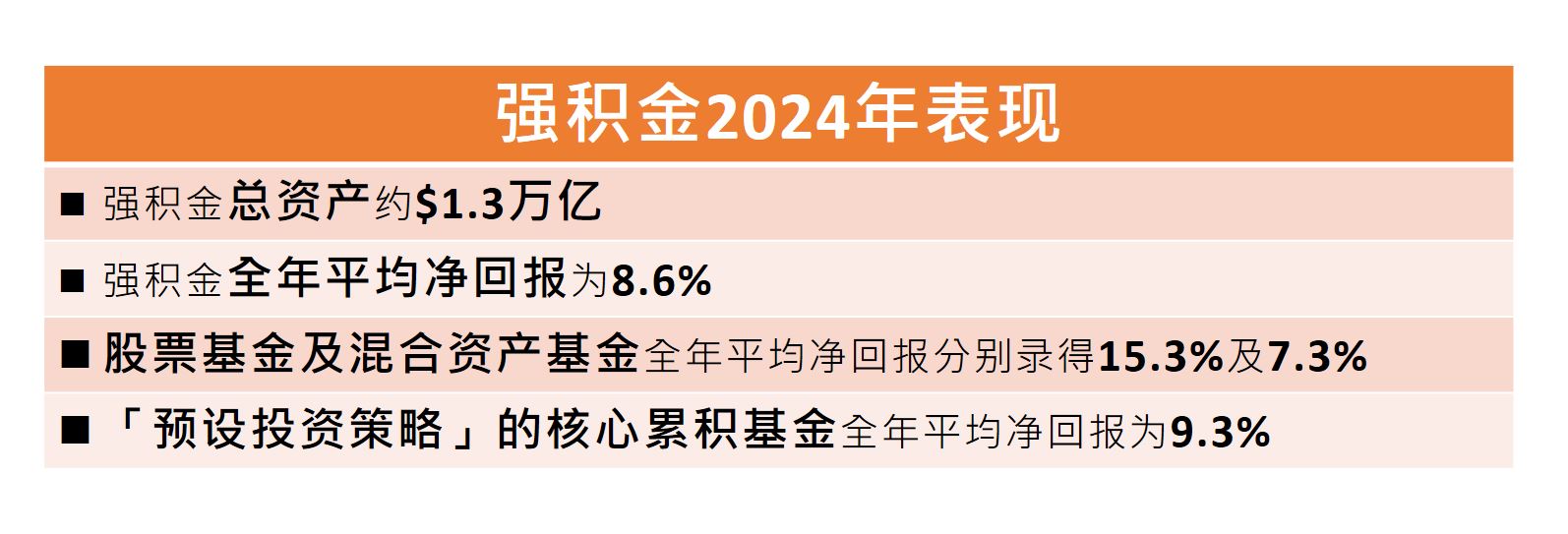 不少打工仔女都会趁着新一年开始,检视强积金表现。强积金在2024年整体投资表现不俗,根据强积金受托人所提交并经积金局核实的资料,全年平均净回报达8.6%,总资产净值於2024年底升至近$1.3万亿。