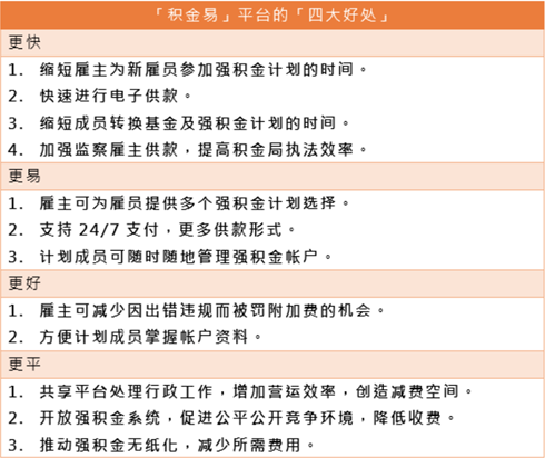 强积金制度是协助打工仔建立长期储蓄习惯的制度,向打工仔提供的服务长达四十年,而筹建中的「积金易」平台,目标是在2022年建成,当平台正式投入服务时,强积金制度已运行了20多年,制度已经「步入中年」。到2040年,第一代的成员(即2000年初进入社会工作的人)将会踏入退休年龄。因此,建构「积金易」平台的重要性可媲美当年设立强积金制度,目的是解决强积金制度多年来以分散模式处理行政工作所衍生的各种问题,把强积金计划的行政工作标准化、精简化和自动化,为雇员、雇主、业界和积金局「四方」缔造「更快」、「更易」、「更好」及「更平」的四大好处(详见下表)。