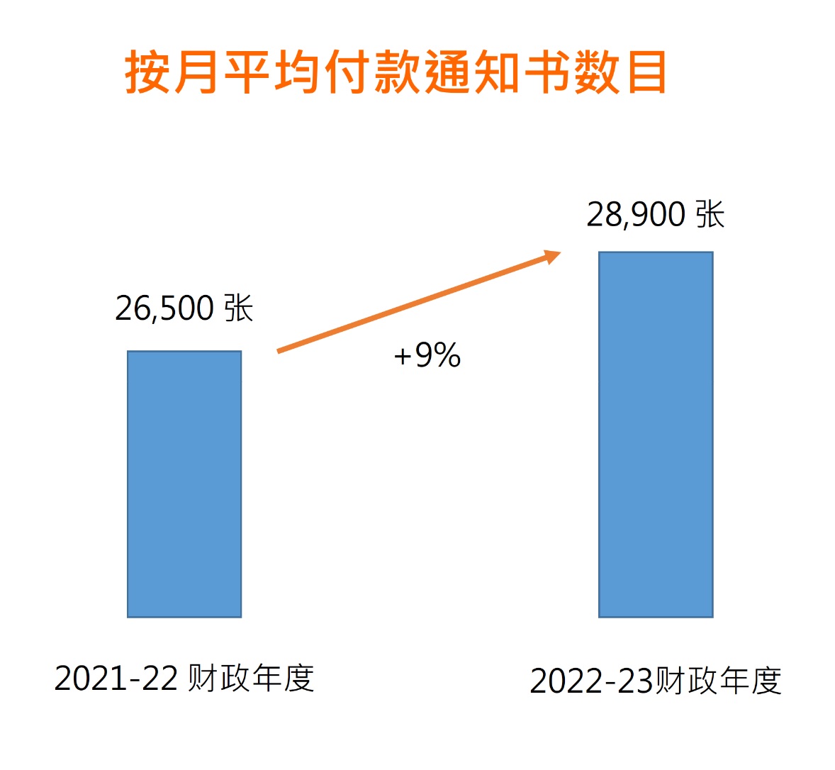 过去两年,积金局向违规雇主发出的「强积金供款及附加费缴款通知书」(付款通知书)亦有所上升,2021-22财政年度约32万张,按月平均26,500张,而2022-23财政年度则发出了35万张,平均每月28,900张,增幅为 9%。随着香港全面复常,预料经济情况亦会持续改善,我期望付款通知书数目上升这趋势亦会因而逆转。