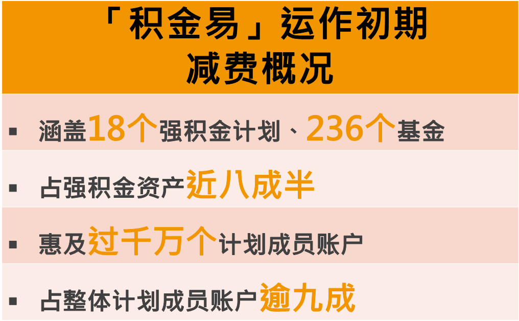 过去一年多,「积金易」的减费成效日渐显着。自「积金易」推出以来,已有10个强积金计划、共110个强积金基金要减行政费。当所有强积金计划加入平台后,全部378个基金中,236个基金(现时占强积金资产近八成半)的行政费须降至不高于「积金易」目前37点子(0.37%)的收费水平,涵盖18个强积金计划,惠及超过一千万个计划成员帐户,占整体计划成员帐户逾九成。