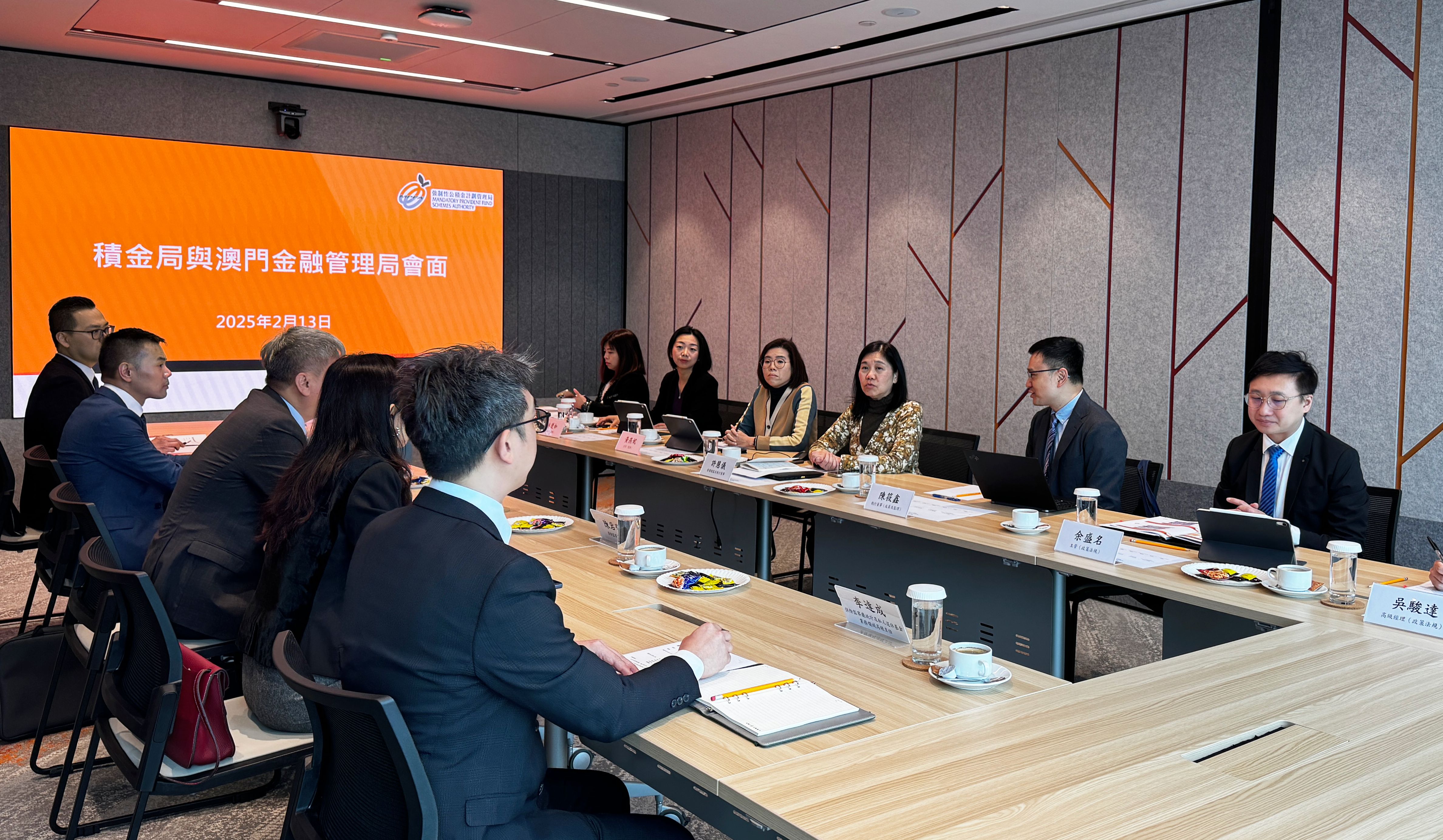 积金局行政总监郑恩赐、营运总监许慧仪、执行董事(成员及监理)陈筱鑫,以及积金局同事於2月13日与澳门金融管理局(澳门金管局)会面,就香港和澳门退休保障制度的最新发展进行交流及分享强积金监管的经验。
