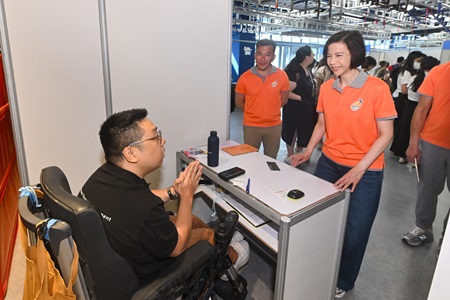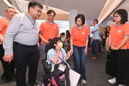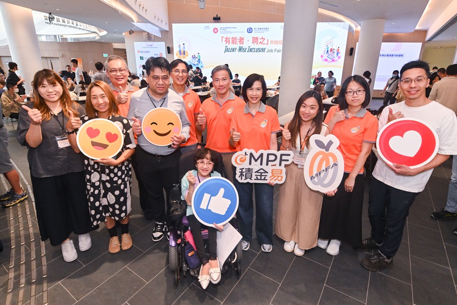 积金局主席刘麦嘉轩、机构事务总监刘家麒和积金局同事于6月25日参与劳工处展能就业科主办的共融招聘会,向参与的伤健求职者推广「积金易」及「预设投资策略」,并聆听他们对强积金的意见。